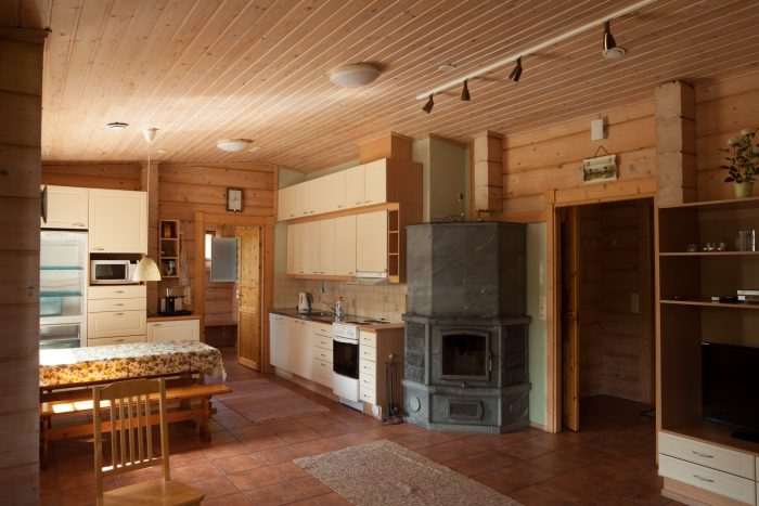 Keittiö olohuoneesta. Mökissä on takka